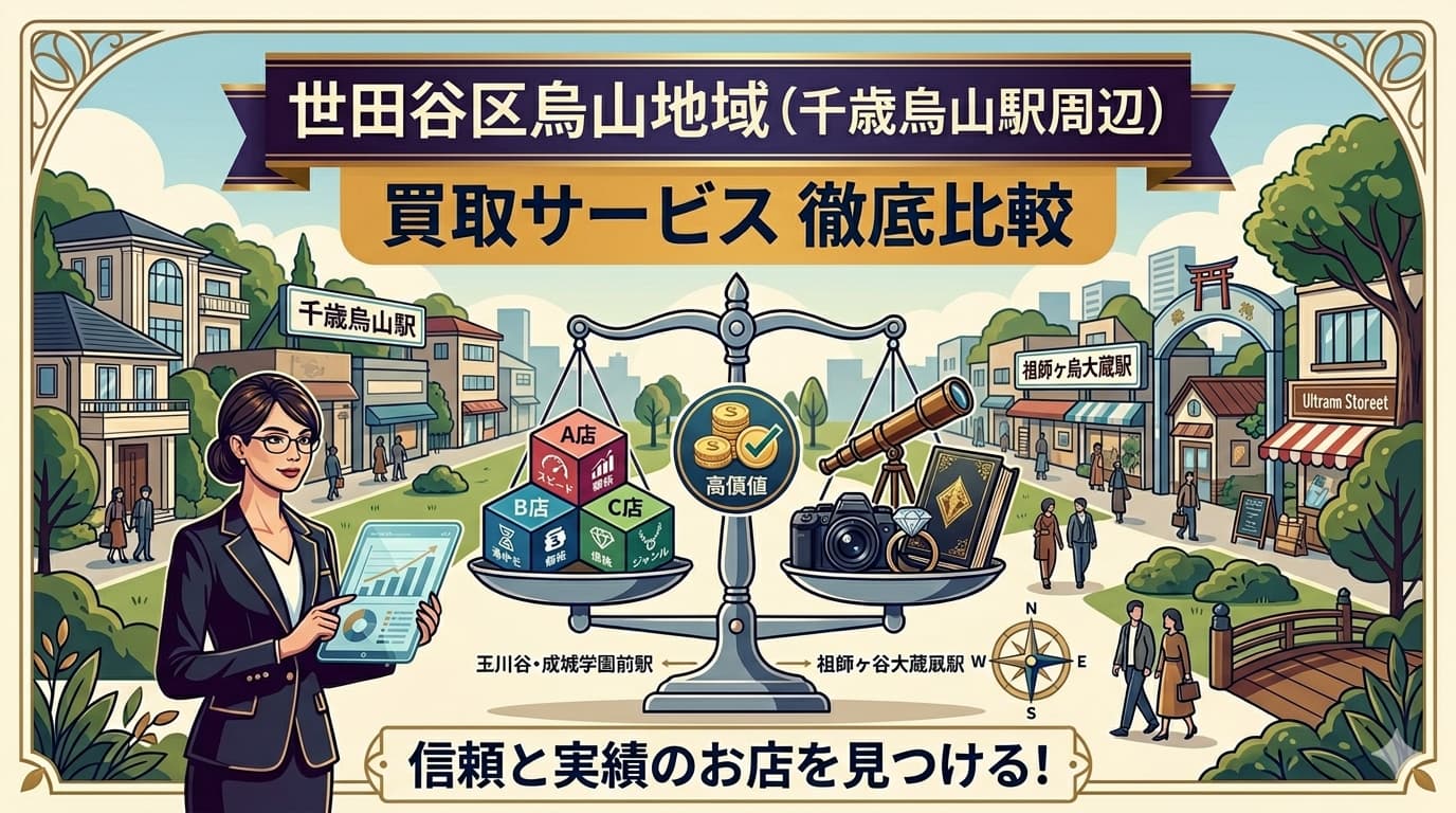 烏山地域は京王線沿線の生活利便性と寺町・蘆花恒春園などの落ち着いた住環境が共存する地域です。ファミリー層と地元居住者の利用が中心で、ブランド品・貴金属・時計・切手や金券類まで幅広い需要が見込めます。無料査定を比較しやすく、最短即日で相談しやすい地域です。